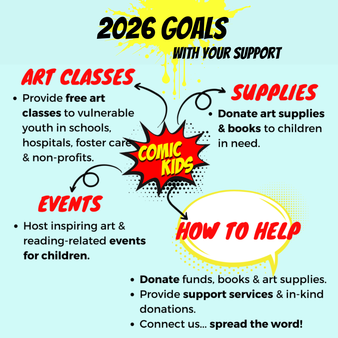Comic Kids is a resource for teachers and afterschool programs to bring art classes, supplies, curriculum, and art books to their kids for free.